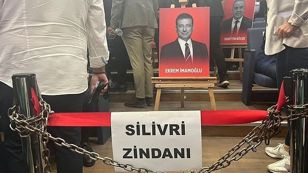 Kurultay salonunda dikkat çeken durumlardan biri de ‘Silivri Zindanı’ köşesi oldu. Silivri Zindanı kısmına cezaevinde tutuklu bulunan belediye liderlerinin fotoğrafları asıldı ve zincir vuruldu. En önde İBB Başkanı Ekrem İmamoğlu’na yer verildiği görüldü.