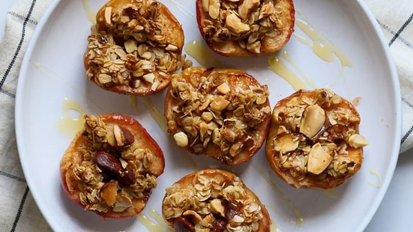 Elmaları ortadan ikiye kesin ve çekirdeklerini çıkarın. İçlerine yulaf, bal ve tarçını yerleştirip, 180°C’de 12-15 dakika pişirin.