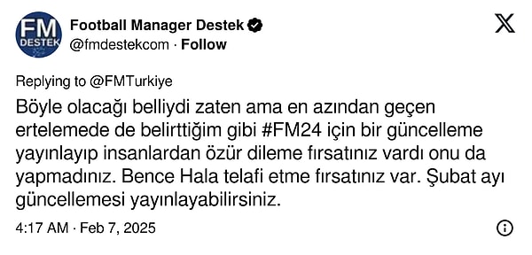 Sports Interactive takımı olarak, SEGA ile yaptığımız ayrıntılı şirket içi görüşmelerin ve titiz değerlendirmelerin akabinde, Football Manager 25’in lansmanını iptal etme formunda güç bir karar aldığımızı üzülerek bildirmek isteriz.