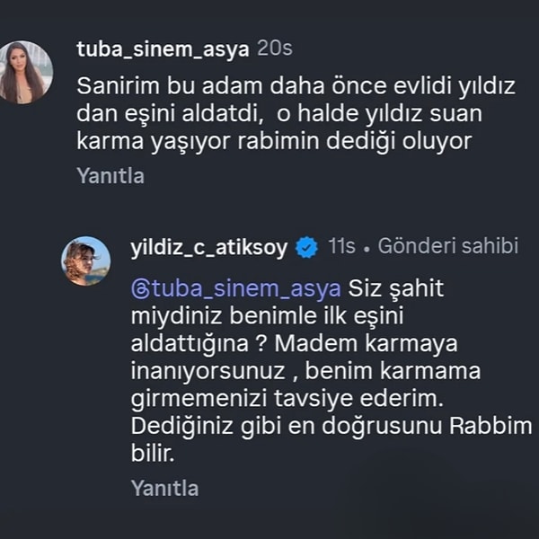 Berk Oktay’ın birinci eşini kendisiyle aldattığı argümanına sonlanan Yıldız Davet Atiksoy, ‘Siz şahit miydiniz benimle birinci eşini aldattığına? Madem karmaya inanıyorsunuz, benim karmama girmemenizi tavsiye ederim. Dediğiniz üzere en doğrusunu Rabbim bilir’ diyerek karşılık verdi.