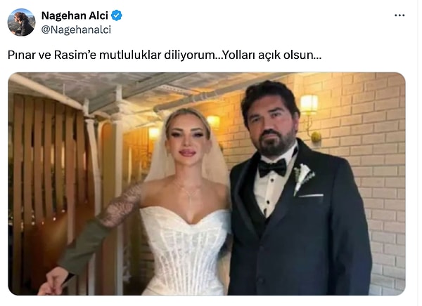 Rasim Ozan Kütahyalı’nın 2023 yılında boşandığı eşi Nagehan Alçı da bu nikaha sessiz kalmadı. X hesabından ikilinin nikah fotoğrafını paylaşan Alçı, “Pınar ve Rasim’e mutluluklar diliyorum…Yolları açık olsun…” yazdı.