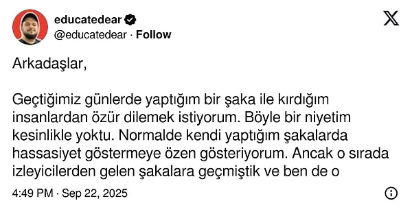 ‘Arkadaşlar, geçtiğimiz günlerde yaptığım bir latife ile kırdığım insanlardan özür dilemek istiyorum. Bu türlü bir niyetim muhakkak yoktu. Olağanda kendi yaptığım latifelerde hassasiyet göstermeye itina gösteriyorum. Lakin o sırada izleyicilerden gelen latifelere geçmiştik ve ben de o latifeyi birinci kere o sırada okudum. O an için kolay bir söz latifesi sandım ama sonrasında üzerine düşünmem gerekirdi. Arkadaşlarım uyarınca fark ettim. Haklısınız. Bunun için özür diliyorum. İlgili kısmı yayından kaldırdık.‘