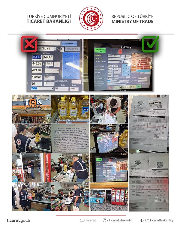 Hatay Ticaret İl Müdürlüğü gruplarımızca itina ile yürütülen araştırmalar sonucunda, imgelerde yer alan toplumsal medya kullanıcısının Abdullah GÜLSAHİN olduğu; bahse husus marketin ise Sakarya Mahallesi Ömerli Apartmanı’nda faaliyet gösteren “Tek Market” olduğu kesin olarak tespit edilmiştir. Kontrollerde satış fiyatları ve stok durumu detaylı halde incelenmiş, firma sahibinin kendi ikrarıyla verdiği beyanında “Sosyal medya üzerinden mizah maksatlı paylaşım yaptım. Eseri alış fiyatım olağanda 351,25 TL’dir. Toplumsal medyada yaptığım paylaşım gerçeği yansıtmamaktadır. Şu an stok durumum 55 adet olarak gözükmektedir.” sözleri tutanakla kayda geçirilmiştir.