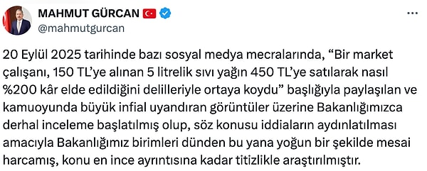 20 Eylül 2025 tarihinde kimi toplumsal medya mecralarında, “Bir market çalışanı, 150 TL’ye alınan 5 litrelik sıvı yağın 450 TL’ye satılarak nasıl %200 kâr elde edildiğini kanıtlarıyla ortaya koydu” başlığıyla paylaşılan ve kamuoyunda büyük infial uyandıran imajlar üzerine Bakanlığımızca derhal inceleme başlatılmış olup, kelam konusu argümanların aydınlatılması hedefiyle Bakanlığımız üniteleri dünden bu yana ağır bir formda mesai harcamış, husus en ince detayına kadar titizlikle araştırılmıştır.