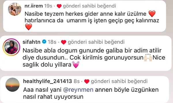 Nasibe Yılmaz, oğlunun doğum gününü kutlamaması üzerine toplumsal medya kullanıcılarının yorumlarını beğenerek Reynemen’e alttan alta bildiri verdi.