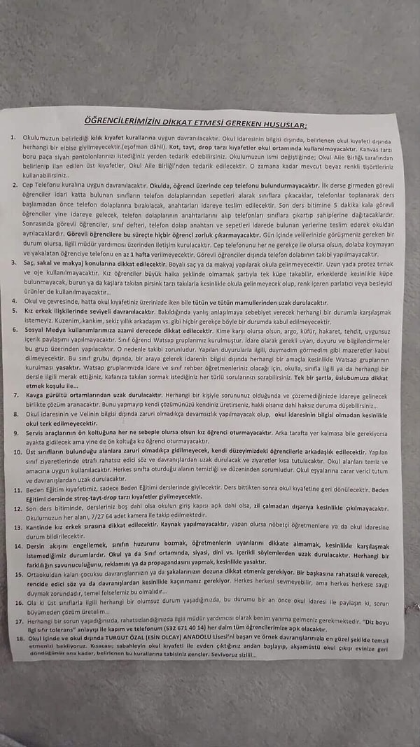 Milli Eğitim Bakanlığı’na bağlı okullarda kayıt süreçleri devam ederken, Düzce’de bulunan Turgut Özal Anadolu Lisesi’nde öğrenci velilerine dağıtılan ve öğrencilerin uyması beklenen enteresan kurallar toplumsal medyada gündem oldu.