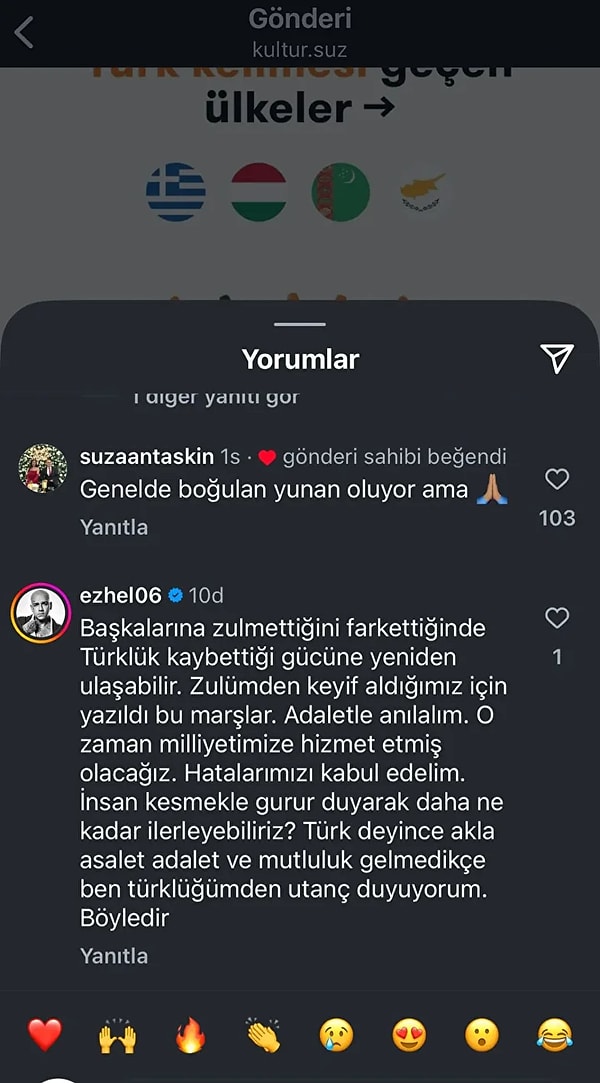 Kültürsüz isimli Instagram hesabının ‘Milli marşında Türk sözü geçen ülkeler’ derleme postuna yorum yapan Ezhel, yaptığı yorumla dikkat çekmişti.
