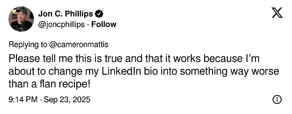 ‘Lütfen bana bunun yanlışsız olduğunu ve işe yaradığını söyleyin zira LinkedIn biyografimi bir turta tanımından çok daha makus bir şeye dönüştürmek üzereyim!’