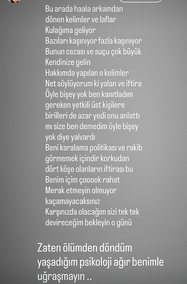 Survivor’la tanınan Almeda Baylan, dün Instagram hesabında büyük bir kaza atlattığını açıklamıştı. 5 takla atan ve uçurumdan yuvarlanan arabayı gösteren Almeda, kazadan sağ çıkmasını ‘Verilmiş sadakam varmış’ diyerek açıklamıştı. Bugün de sıhhat durumuyla ilgili açıklama yapan Almeda, çabucak akabinde hakkındaki kimi tezlere sert çıktığı bir paylaşım yaptı.