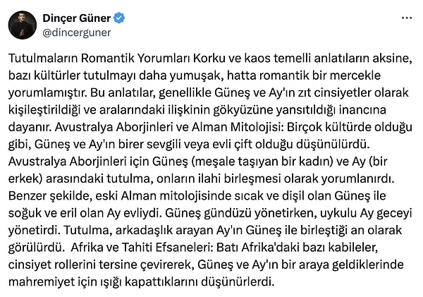 Astroloji dünyasının en değerli fenomenlerinden Güneş ve Ay tutulmaları rastgele olaylar değildir. Tam bilakis ‘evrenin devasa saat mekanizmasının’ eşsiz birer kesimidir. Ünlü astrolog Dinçer Güner de tutulmaların nizamlı ve kestirim edilir olduğunu anlamanın ‘insanlık tarihindeki en büyük entelektüel sıçramalardan biri.’ olduğunu söylüyor.