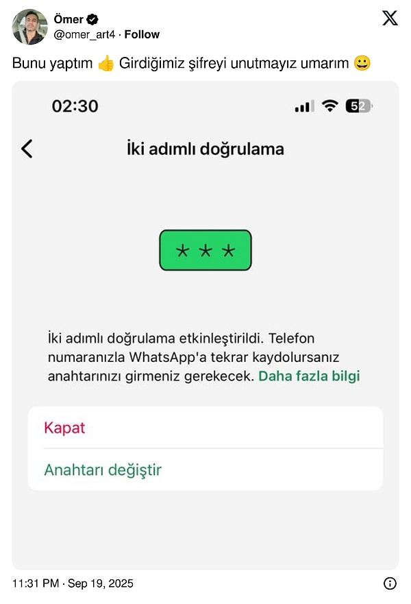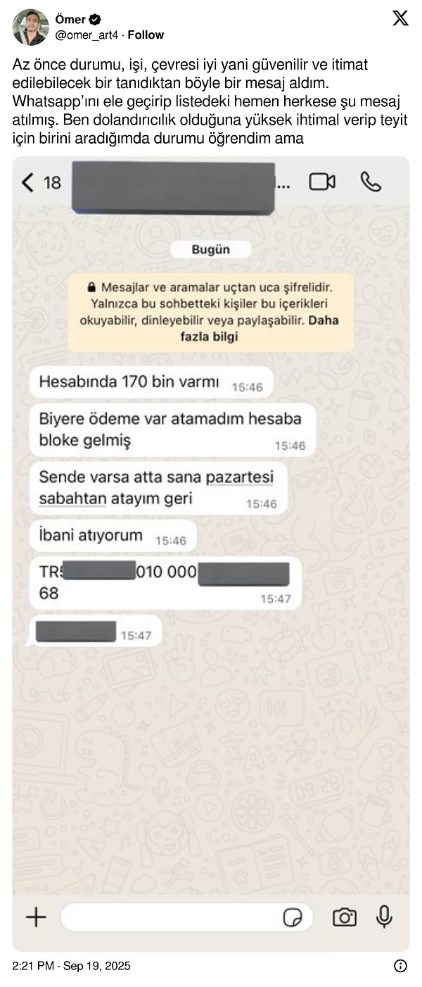 Kullandığımız her uygulama ferdî güvenliğimizi sorgulamamıza neden olurken X’te bir dolandırıcılık atağı ağızları açık bıraktı. Artan dolandırıcılıklara bu sefer WhatsApp da eklendi. X’te ‘@omer_art4′ isimli bir kullanıcı yaşadığı dolandırıcılığı paylaştı. Dikkat, sizin de başınıza gelebilir! Dolandırıcılar sizin yahut bir yakınınızın WhatsApp’ını ele geçirebilir. İşte herkesin dikkat etmesi gerektiğini bir sefer daha gözler önüne seren o paylaşım👇🏻