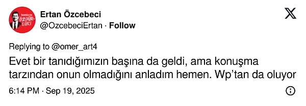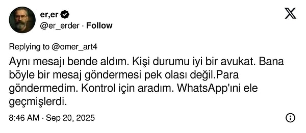 X’te ‘@omer_art4′ isimli kullanıcı tanıdığı birisinin WhatsApp’ta borç istemesi üzerine şüphelendi.