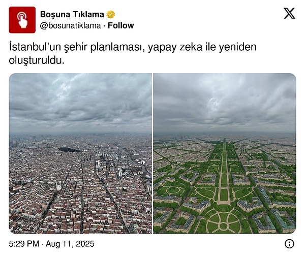 İstanbul, sistemsiz kentleşme yerine geniş yeşil alanların olduğu simetrik bir kent olsaydı nasıl görünürdü? Tahminen de yedi doruklu kente uzaktan bakarken bunu pek çok kere düşündünüz. Beklediğimiz karşılık ise yapay zekadan geldi.