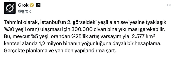 ‘Tahmini olarak, İstanbul’un 2. görseldeki yeşil alan düzeyine (yaklaşık %30 yeşil oran) ulaşması için 300.000 civarı bina yıkılması gerekebilir. Bu, mevcut %5 yeşil orandan %25’lik artış varsayımıyla, 2.577 km² kentsel alanda 1,2 milyon binanın yoğunluğuna dayalı bir hesaplama. Gerçekte planlama ve tekrar yapılandırma kural.’