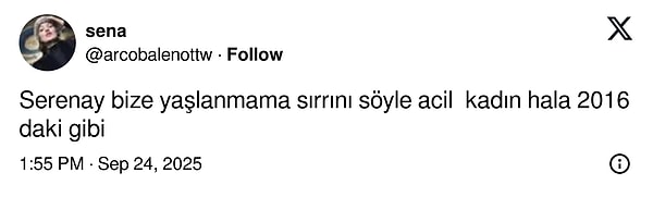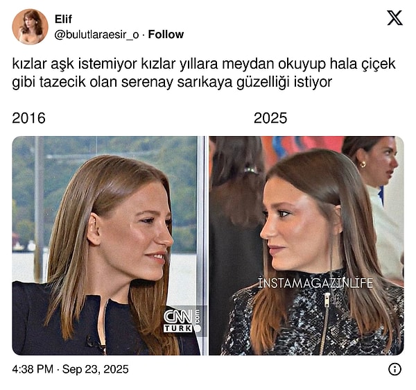 Geçtiğimiz gün 50.000 TL’lik yeşil peluş terliğiyle gündem olan Serenay Sarıkaya, bu kere yıllara meydan okuyan hoşluğuyla toplumsal medyanın lisanına düştü. Bir kullanıcı, ünlü oyuncunun 2016 ve 2025’teki karelerini yan yana koydu. Sarıkaya’nın yüzündeki neredeyse sıfır farklılık herkesi şaşkına çevirdi.